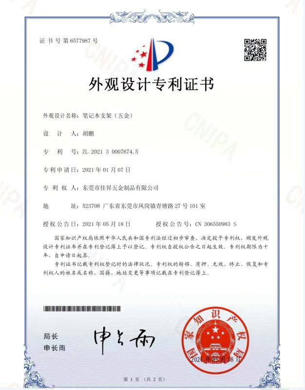 ◆ 專利權: 擁有8項由國家知識產(chǎn)權局頒發(fā)的外觀設計專利證書
